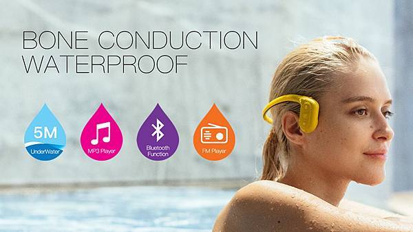防水藍牙耳機,內置mp3(存儲容量高達8GB)和FM播放器,採用骨傳導技術,讓您可以在欣賞外界的同時聆聽音樂。